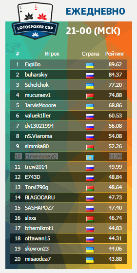 Сегодня последний день февральского этапа ежедневных фрироллов LotosPoker Cup. На 10 месте расположился казахстанец «t1memoneyQ«, у которого почти 52 очка. Напоминаем, что каждый месяц лучшие двадцать игроков получают в подарок бездепозиттные бонусы по $200, а победитель ещё и