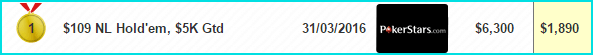 1 место на PokerStars за $109, $5K Gtd — $1,890