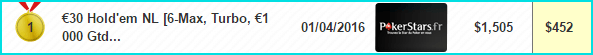 1 место на PokerStars.fr за €30, $1K Gtd — $452