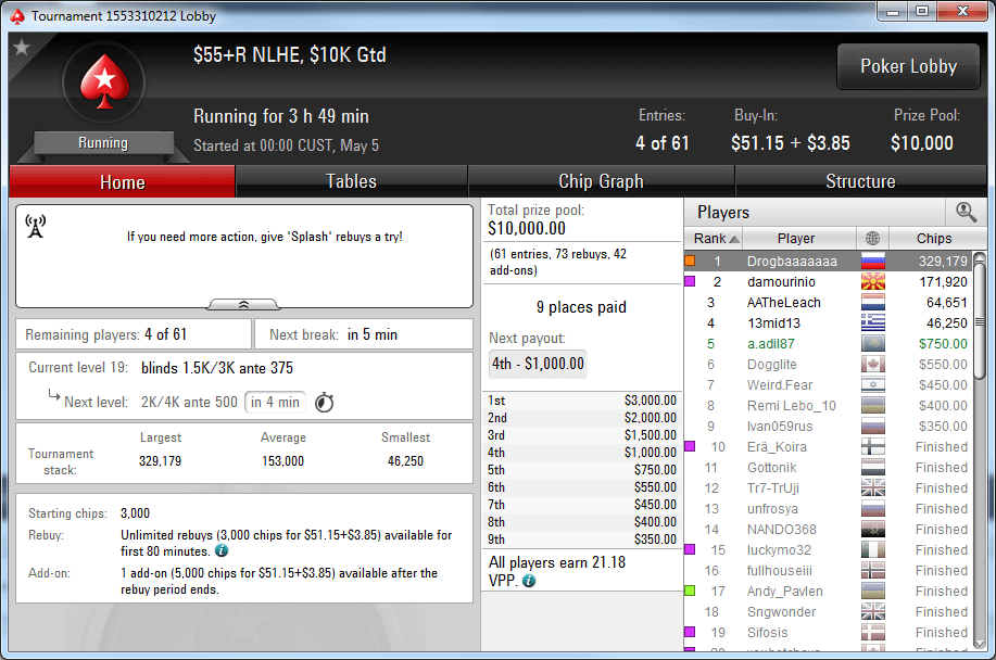 Лучшая сессия, постоянно флопал сеты, стриты, премиум часто раздавался. Итог: 3 финалки, одно жирное первое место (13к вместе с баунтями).