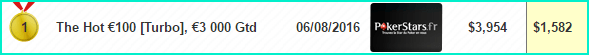 1 место на PokerStars.fr The Hot €100, €3K Gtd — €1,582