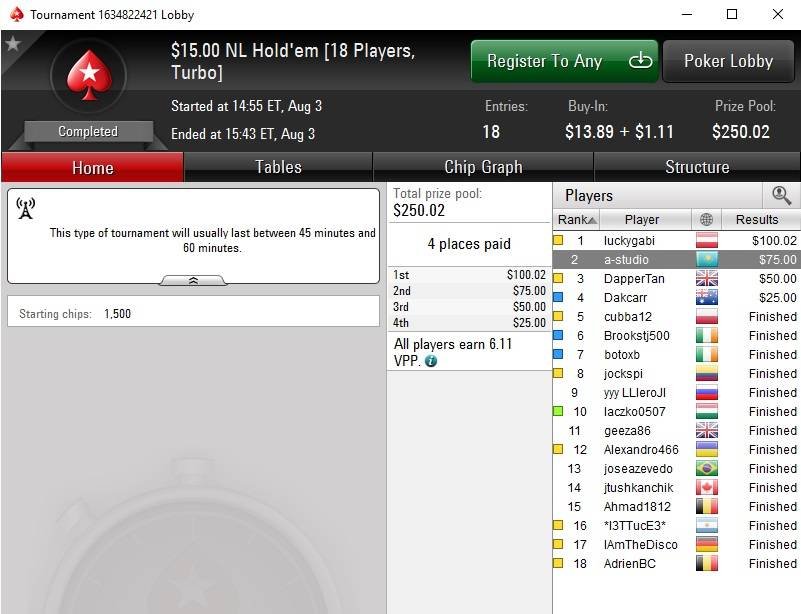 Турбо мт-снг 18-макс по $15. Номер турнира 1634822421. Результат — 2-е место, $75,00.