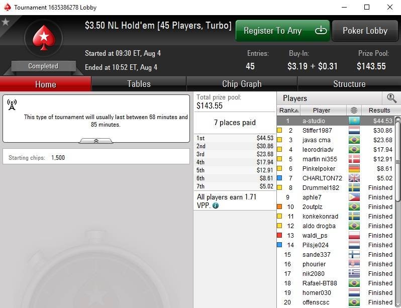 Турбо мт-снг 45-макс по $3,5. Номер турнира 1635386278. Результат — 1-е место, $44,53.
