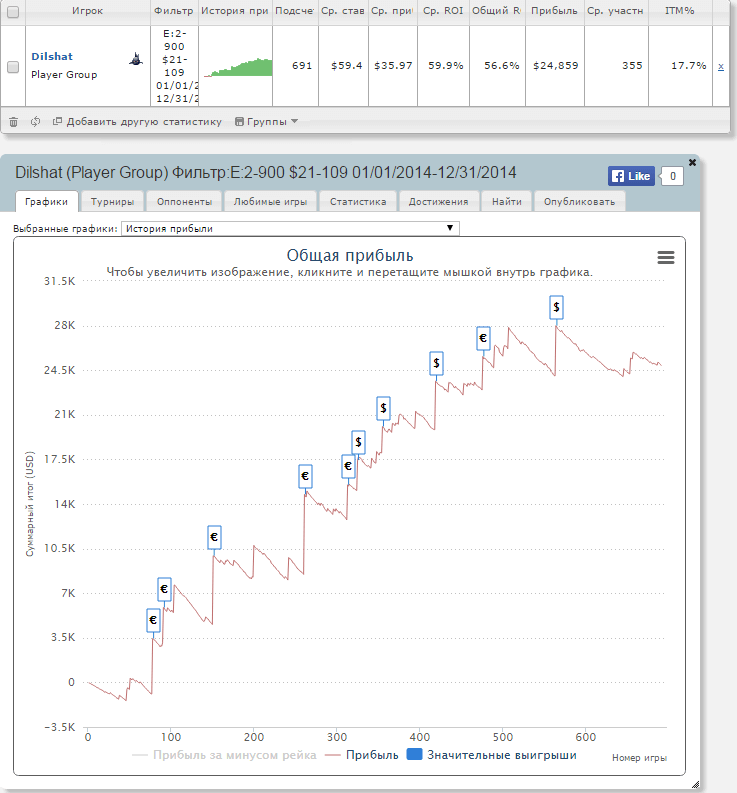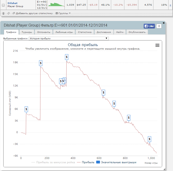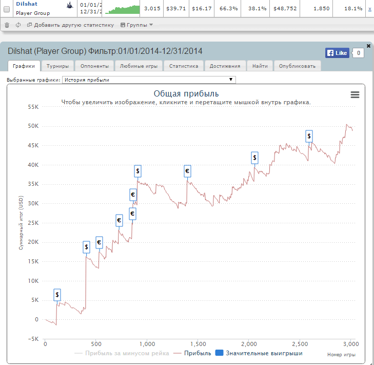 Год в онлайне получился довольно не плохим, поднялся с АБИ 22$ до 45$. Мог и выше играть, но сам не решался, хотя все возможности у меня были. Ну это не страшно, в 2015 буду поднимать планку. Тут я сам специально не поднимал лимиты, хотел начать как раз с нового года увеличивать АБИ. РОИ по шарку получился 38,1%, по факту же думаю что РОИ в районе 30-32%, что собственно не плохо. Правда за год сыграл очень мало, чуть больше 3000 турниров, совсем не годится.