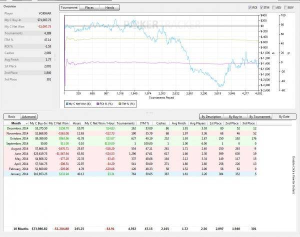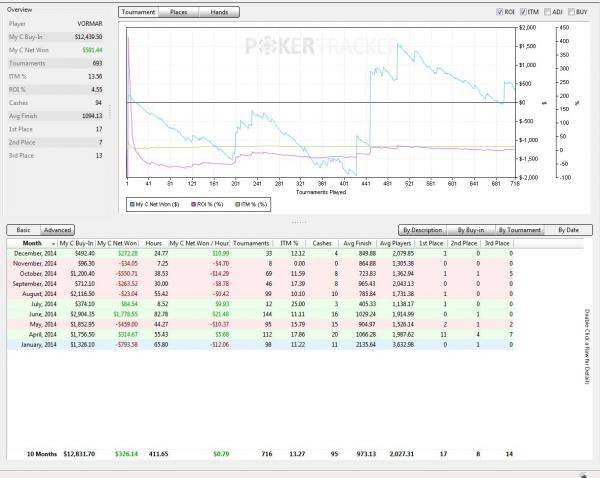 В целом год выдался нестабильным, наверное как и прошлый год, к примеру 2 месяца играю, вроде подымаюсь, потом месяц сижу без БРа поймав стрик или проиграв все на ставках и казино ( да да я опять в этом году туда прилично залил), все это психологически очень давит, ты вроде только нащупываешь свою игру как через некоторое время снова оказываешься без банкролла, а потом снова приходиться начинать все с самого начала. Конечно как и у любого МТТшника у меня были неплохие глубокие проходы в хороших турнирах и сложись они в мою сторону, все могло быть совершенно по другому, но как говорится это покер. Думаю, что игрок заслуживает, то он со временем и получает, а я к сожалению не работаю ни над своей дисциплиной, ни над своей игрой, вот поэтому и такие унылые графики и получаются. Если бы я поставил общую оценку своей игры и своему отношению к делу в этом году, то это была бы 3ка с жирным минусом. Если написать о непокерной жизни, то все было хорошо, я посетил множество стран, от души попутешествовал, побывал в Германии, Бельгии, Швеции, Латвии, Италии, Испании, Эстонии, Финляндии, узнал много нового, познакомился с хорошими и приятными людьми. Единственное, что беспокоит, то это то что пока не наладил свою личную жизнь))) В 2015 исполнится 30 лет, а серьезных отношений пока нет. В этом возрасте пора бы жениться и создать семью. Так что это основной приоритет на наступающий 2015 год.