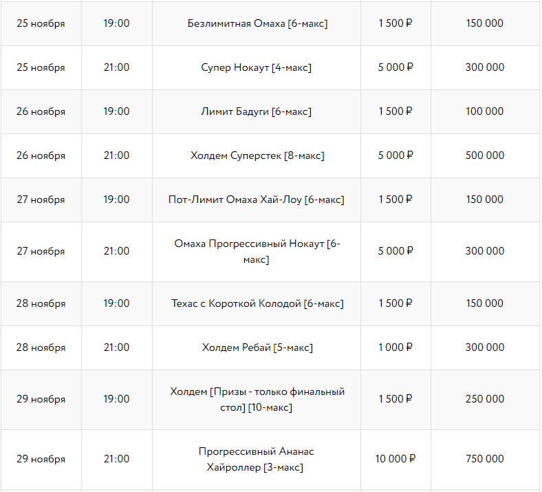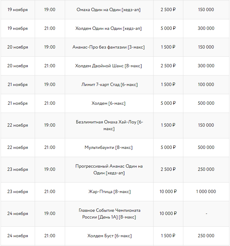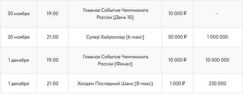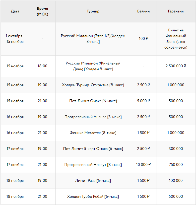 - cпециальный турнир «Русский Миллион» с бай-ином 100 рублей и гарантией 2 500 000 ₽;