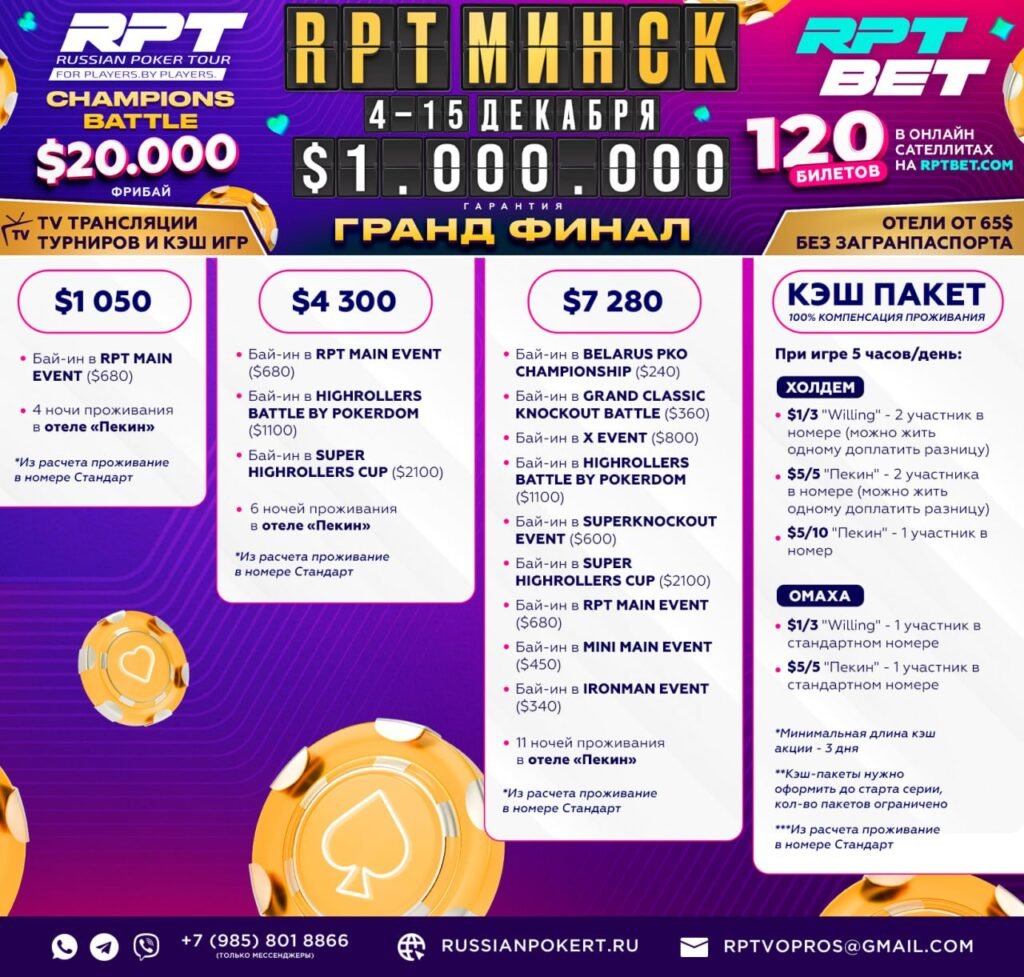 Гранд Финал Russian Poker Tour пройдет в Минске с 4 по 15 декабря, гарантия $1,000,000. Подробно