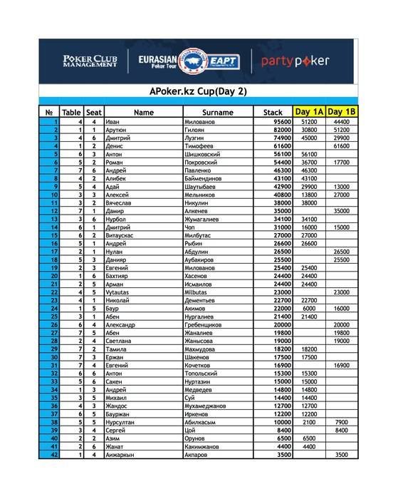 После окончания дня в итоге мы имеем 42 покеристов сумевших пройти далее. Впереди нас ждет ещё один стартовый день и поздняя регистрация в Дне 2. Напомним, стеки участников в Дне 2 объединяются.
