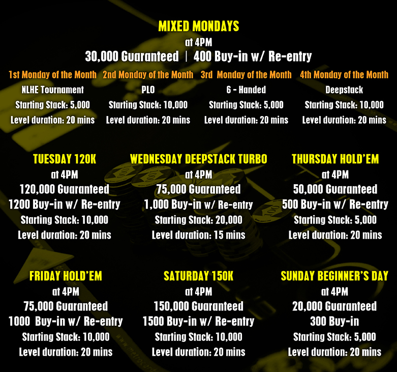 Расписание регулярных турниров в Metro Card Club:
