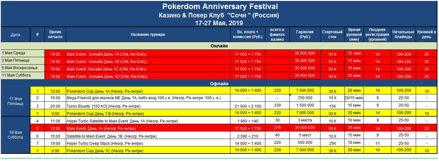 Pokerdom Anniversary Festival пройдет с 17 по 27 мая в казино Сочи — первом элитном казино, расположенным в живописной игорной зоне «Красная поляна». 11 дней праздника покера включат в себя круглосуточную кеш-игру, турниры по Холдему, Омахе и Китайскому «Ананасу» с общим гарантированным призовым фондом более 60 миллионов рублей!