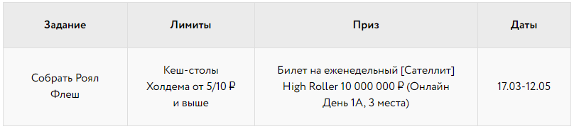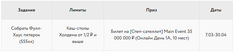 Бесплатное участие в сателлите смогут принять игроки, собравшие в течение недели наибольшее количество комбинации «Фулл Хаус» за кеш-столами Холдема от 5/10 ₽.