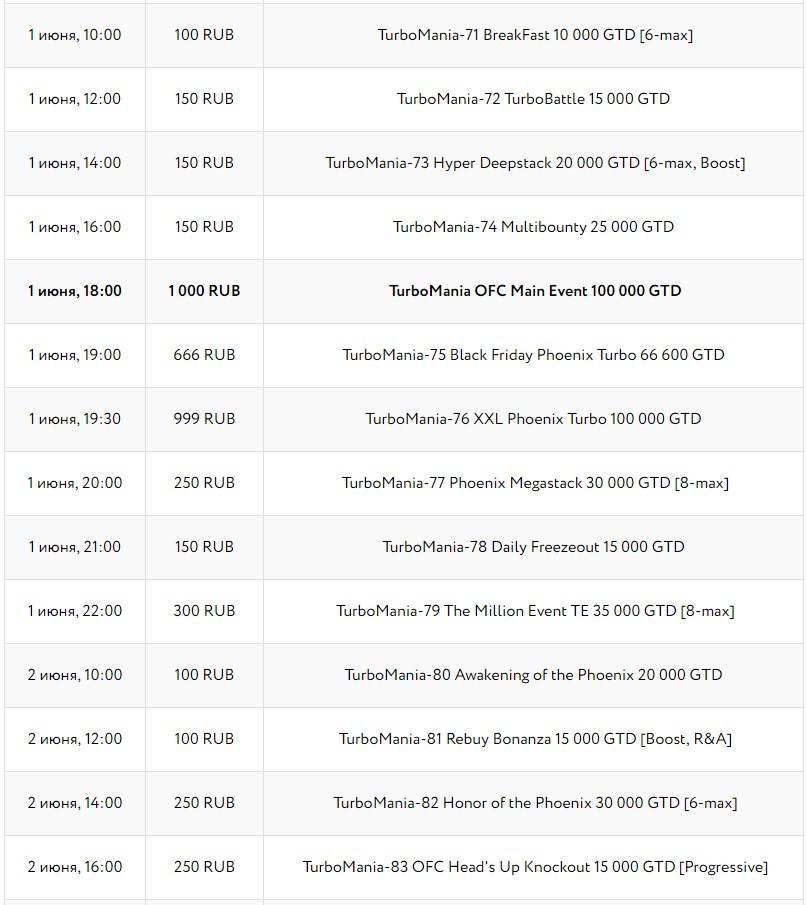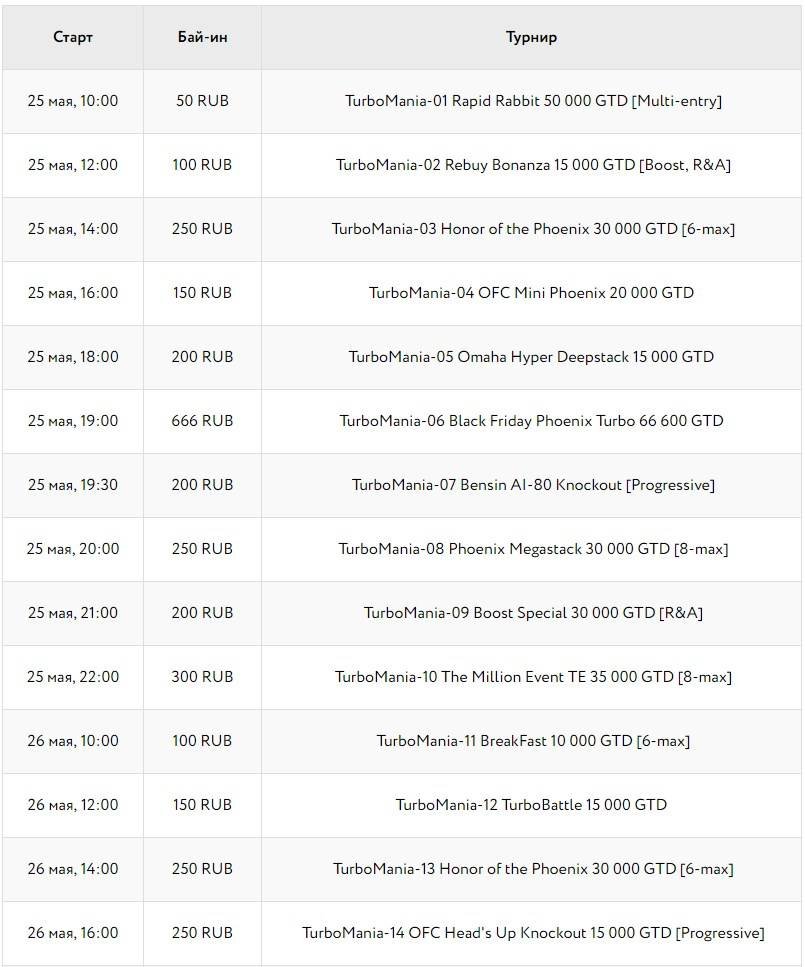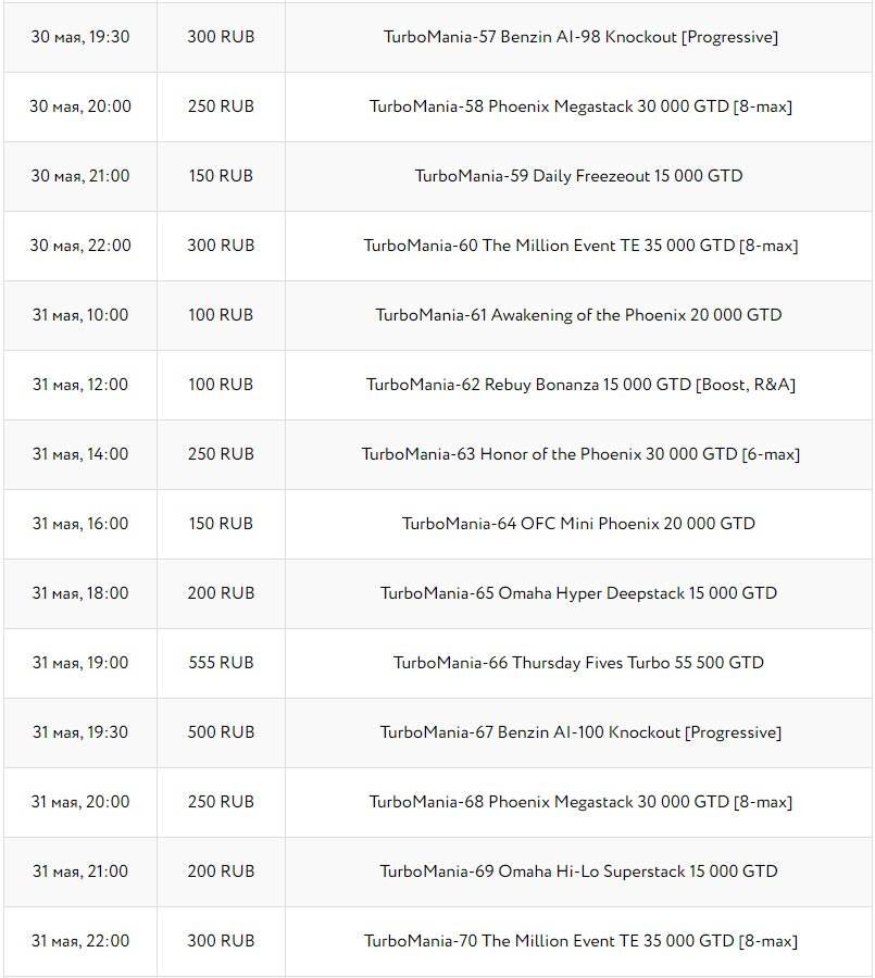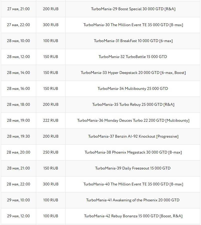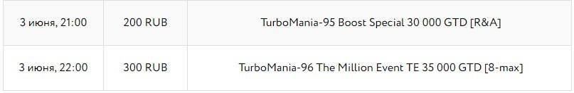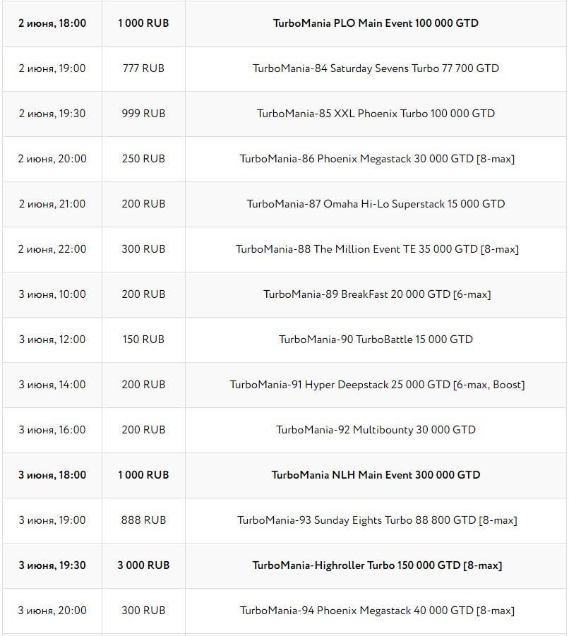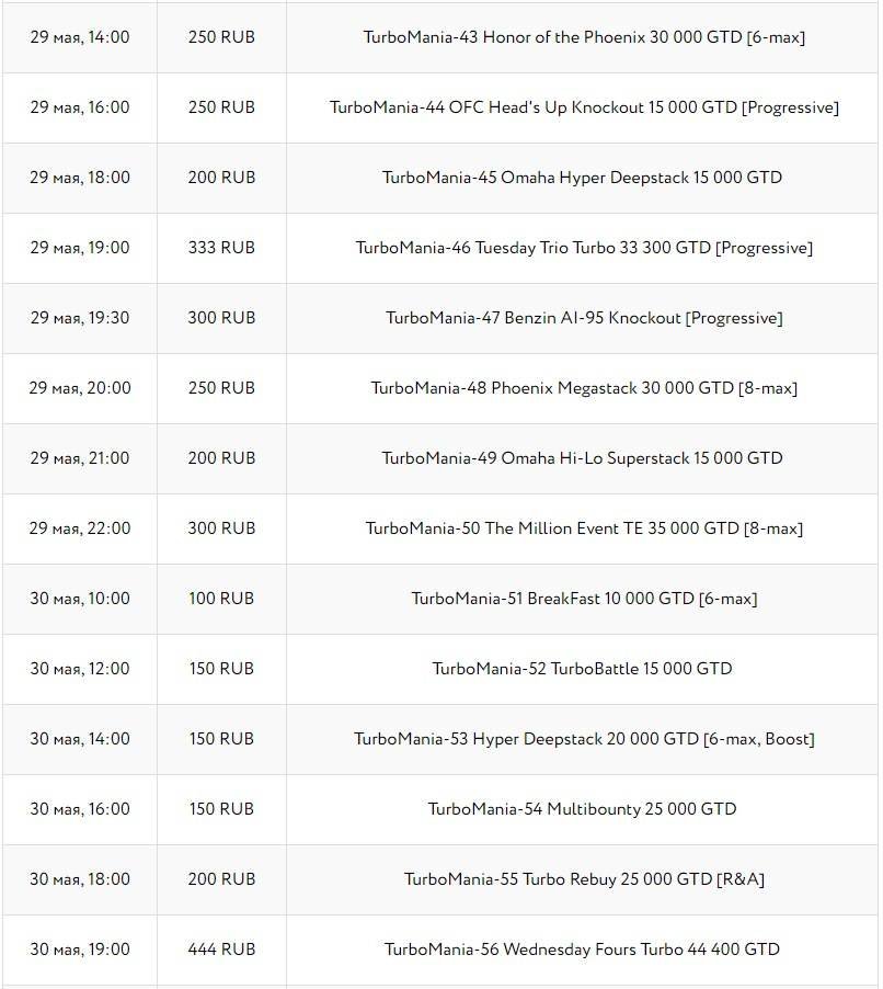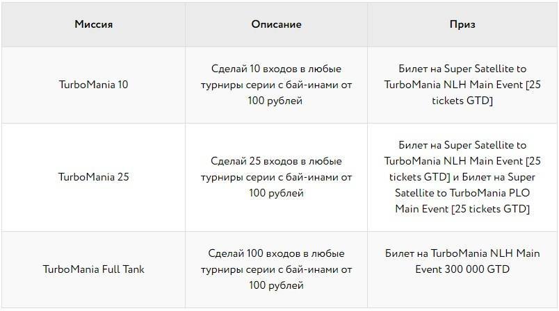 - За каждый сыгранный турнир в рамках серии TurboMania с бай-инами от 100 рублей и выше игрок получает 1 балл в таблицу лидеров TurboMania Missions. Повторные входы (re-entry) также приносят баллы.