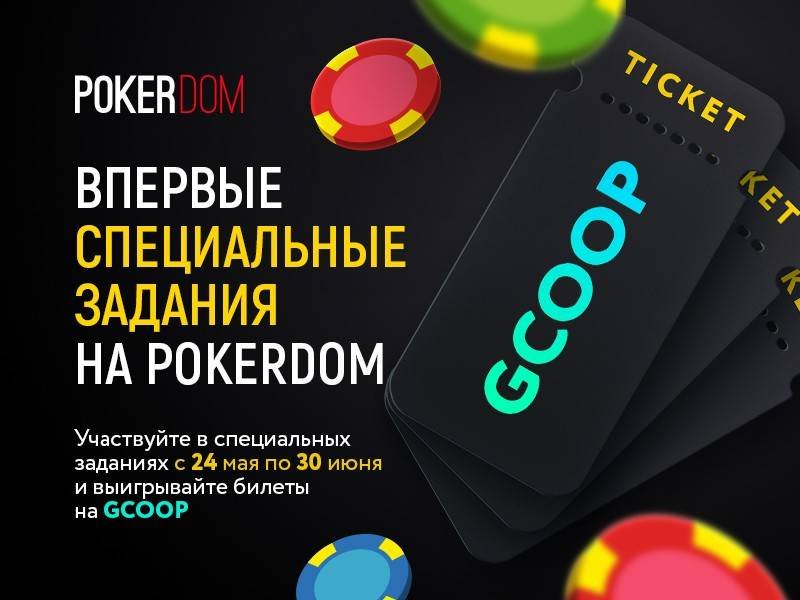 До 30 июня каждый игрок PokerDom сможет заработать билет на одно из событий серии GCOOP выполняя ежедневные задания за кэш-столами Холдема и Омахи. Например, собрав комбинацию Royal Flush за кеш-столом Холдема с лимитами от 15/30 рублей, вам будет автоматически зачислен билет на GCOOP Main Event стоимостью $100.