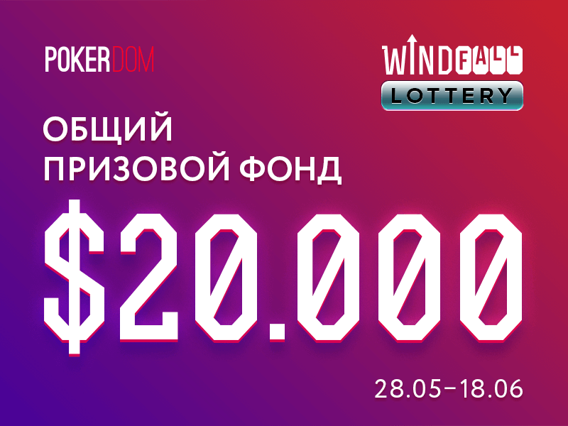 Напоминаем, что на PokerDom проходит Лотерея WindFall. До 18 июня у вас есть возможность заработать свой билет для участия в розыгрыше $5 000 и 100 билетов на Главное Событие серии GCOOP с гарантированным призовым фондом в $40 000!