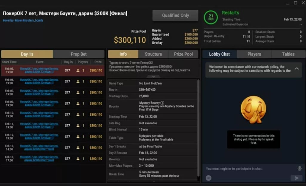Турнир состоится в формате Mystery Bounty и будет многодневным. Бай-ин — $77. Помимо денежных выплат за нокауты, участники смогут выиграть ценные призы, которые будут выпадать из баунти-сундуков: