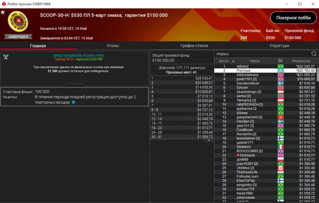 Ивент под №30 по ПЛ Омахе за $530 и гарантией $150К собрал 177 человек и 111 ре-энтри.