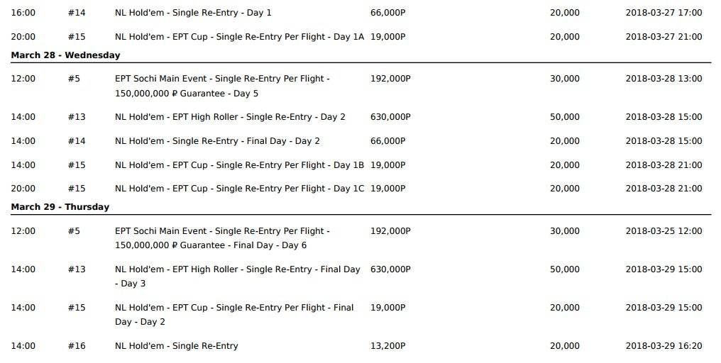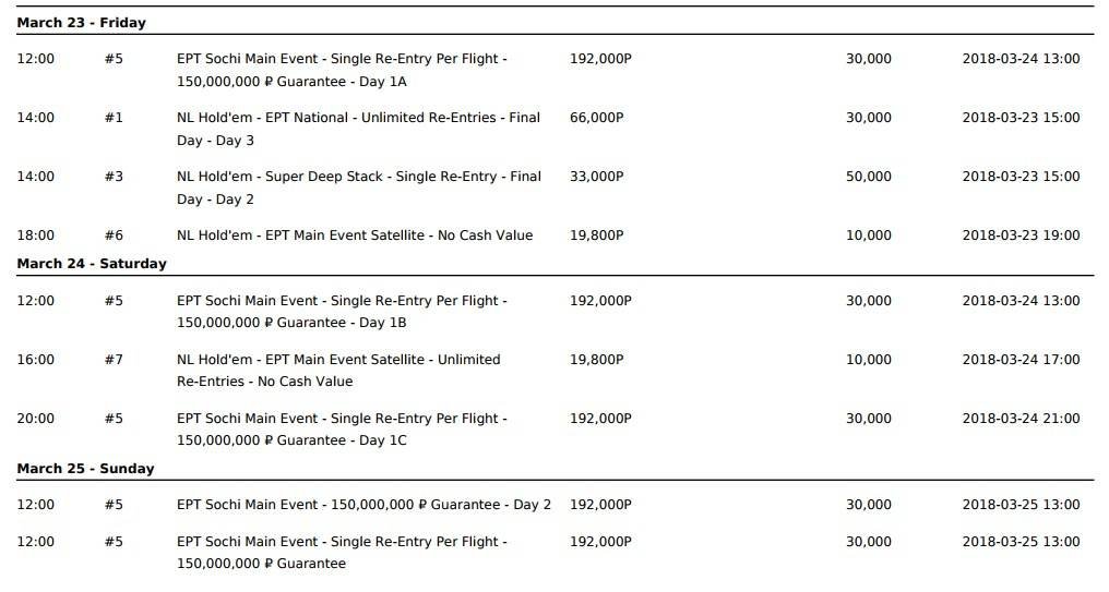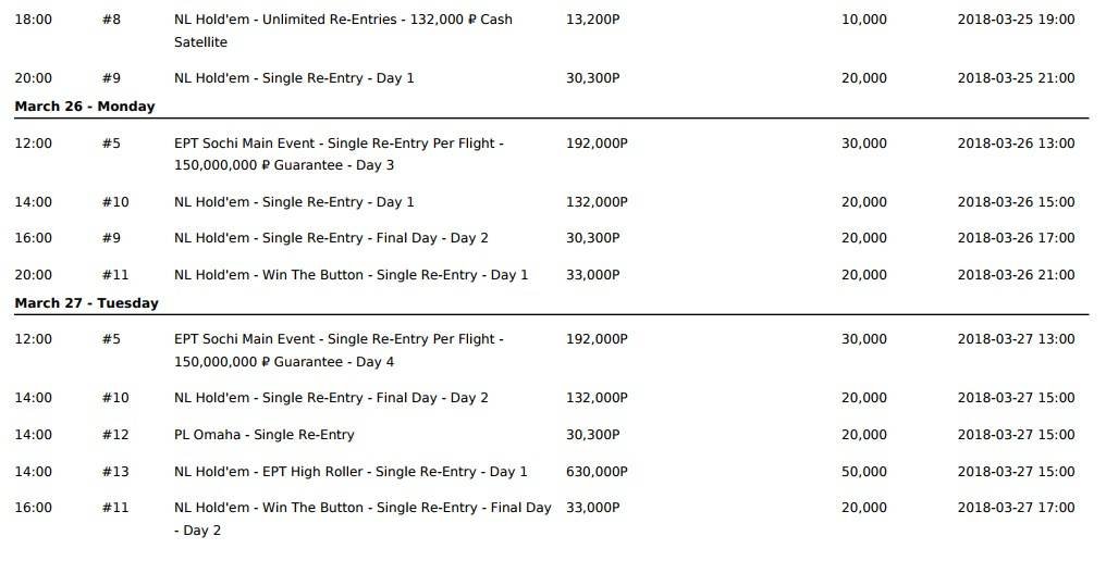 Сетка турниров также включает множество сателлитов и основные события, среди которых турнир Хайроллеров за 617,000 рублей и EPT National с бай-ином 66,000 рублей.
