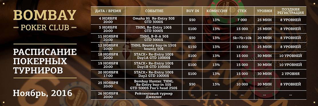 Покерный клуб казино Bombay 26 ноября в 20:00 проведет рейтинговый джекпот фриролл турнир. Призовой фонд джекпота формируется из 6% от комиссии еженедельных турниров в течение трех месяцев. Игроки имеющие рейтинговые баллы участвуют в джекпот фриролл турнире бесплатно.