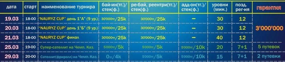 Начинаем в эту субботу 4 марта с классического ребайника по 10’000 тенге, 11 марта играем в Омаху с нокаутами (6 max). 19-21 марта трехдневный турнир Nauryz Cup, с новой структурой блайндов. В эту же неделю, 25 марта мы проведем сателлит на Чемпионат Казахстана, где разыграем сразу 5 путевок на основное событие весенней серии.