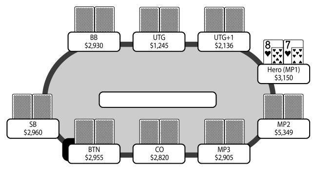 Эта раздача произошла в начале турбо-турнира с бай-ином $50 на Full Tilt; глубина стеков составляла 75 ББ. Находясь на позиции MP1, я открыл торговлю рейзом до 3 ББ с рукой 8♥-7♥. Хотя я бы не возражал против того, чтобы уравнять чей-то префлоп рейз с такой рукой, мне не очень нравилось открывать с ней торговлю и, в принципе, я бы мог сбросить её. Однако на ранних стадиях таких турниров я стремлюсь разыгрывать как можно больше рук.