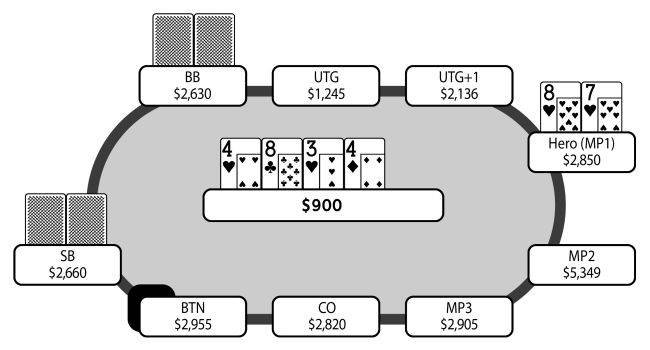На тёрне я собрал мелкий флеш, а расклад выглядел следующим образом: 8♣-4♥-3♥-4♦-5♥. Малый блайнд сделал странную микроскопическую ставку величиной 40 фишек в банк величиной 900 фишек. Большой блайнд довольно быстро переставил её рейзом до 560 фишек. Я был убеждён, что мой флеш имеет невысокие шансы на победу, но делать фолд было бы абсурдом. Поэтому я сделал колл, а малый блайнд сбросил карты. Большой блайнд показал руку A♥-9♥ и выиграл банк с более высоким флешем. Мне подумалось, что это, пожалуй, было наказанием за то, что на префлопе я открыл торговлю со слишком слабой рукой, но при этом я был доволен, что не проиграл большее количество фишек. Я также задаюсь вопросом: мог ли большой блайнд заработать со своей рукой больше, если бы сделал рейз на флопе? У него была довольно сильная рука – натсовое флеш-дро и оверкарты. Я всего лишь открыл торговлю на префлопе и сделал ставку-в-продолжение на флопе, поэтому мой диапазон рук оставался довольно широким. Малый блайнд всего лишь уравнял ставку-в-продолжение на флопе, поэтому у него вряд ли могла быть особенно сильная рука. Если бы большой блайнд сделал рейз, у него были бы хороший шанс выиграть банк немедленно (например, я бы сбросил руки A-x). Даже если бы у меня или малого блайнда оказалась сильная рука вроде оверпары, он бы всё равно выиграл банк примерно в 45-50% случаев.