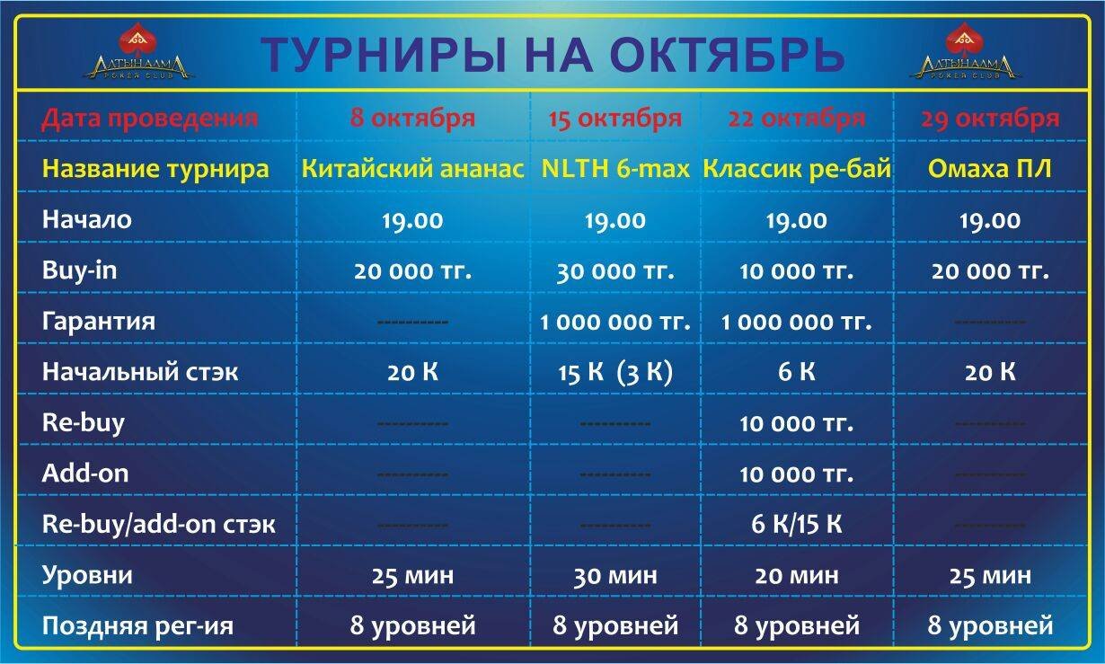 Все турниры начинаются в 19:00, поздняя регистрация везде 8 раундов. При возникновение любых вопросов смело набирайте наш рабочий номер: 8 707 530 8877, ответим на все Ваши вопросы. А лучше сразу приходите к нам в клуб, по мимо турниров Кеш игра идёт круглосуточно. Всегда найдётся место для желающих приятно скоротать время или приумножить свой капитал.