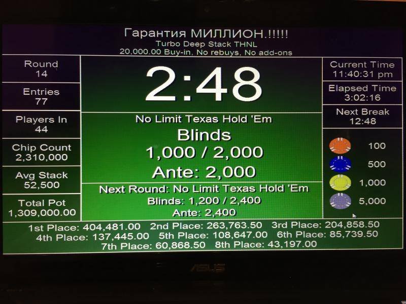 В субботу у нас прошёл Турнир «Turbo Deep Stack», очередной, субботний Миллионник в «Алма Сити». Было произведено 77 регистраций, мы получили 1’3.М призового фонда.