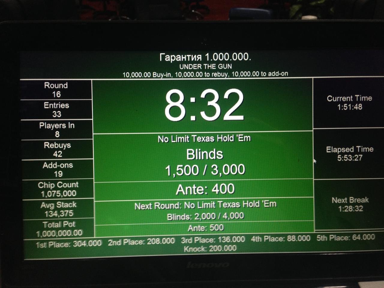 Позвольте осветить Вам, Субботнее Соревнование, прошедшее в нашем Клубе, Турнир «Under The Gun». Майские праздники дают о себе знать, народу собирается меньше, но это есть хорошо для Вас, уважаемые участники. Меньше Игроков – Больше шансов на Победу, так как Гарантии на МайскиеТурниры у нас ещё никто не отменял!!! Разыграли Миллион по 10.К, да ещё 4 фишки «гуляли» по столам, стоимостью в 50’000 каждая.