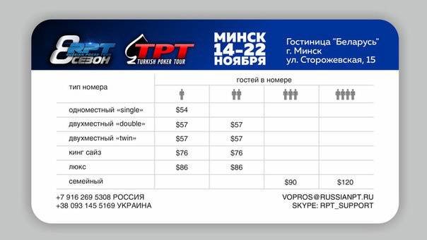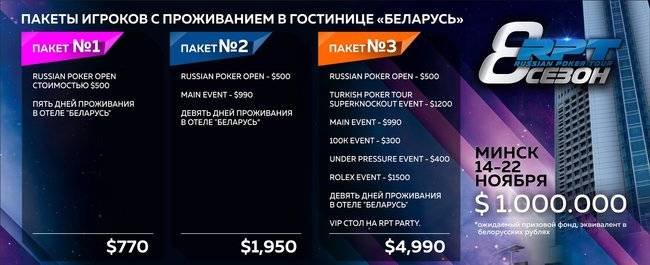 В Минске гостей RPT ждут десятки турниров и два главных события: Russian Poker Open по $500 – крупнейший в СНГ по количеству и соотношению бай-инов к призовым – и Main Event по $990. С остальными турнирами вы можете детальнее ознакомиться, посмотрев расписание предстоящей серии.