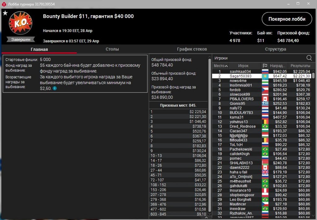 Казахстанец “Saga150393” стал вторым в турнире Баунти Билдер на PokerStars.