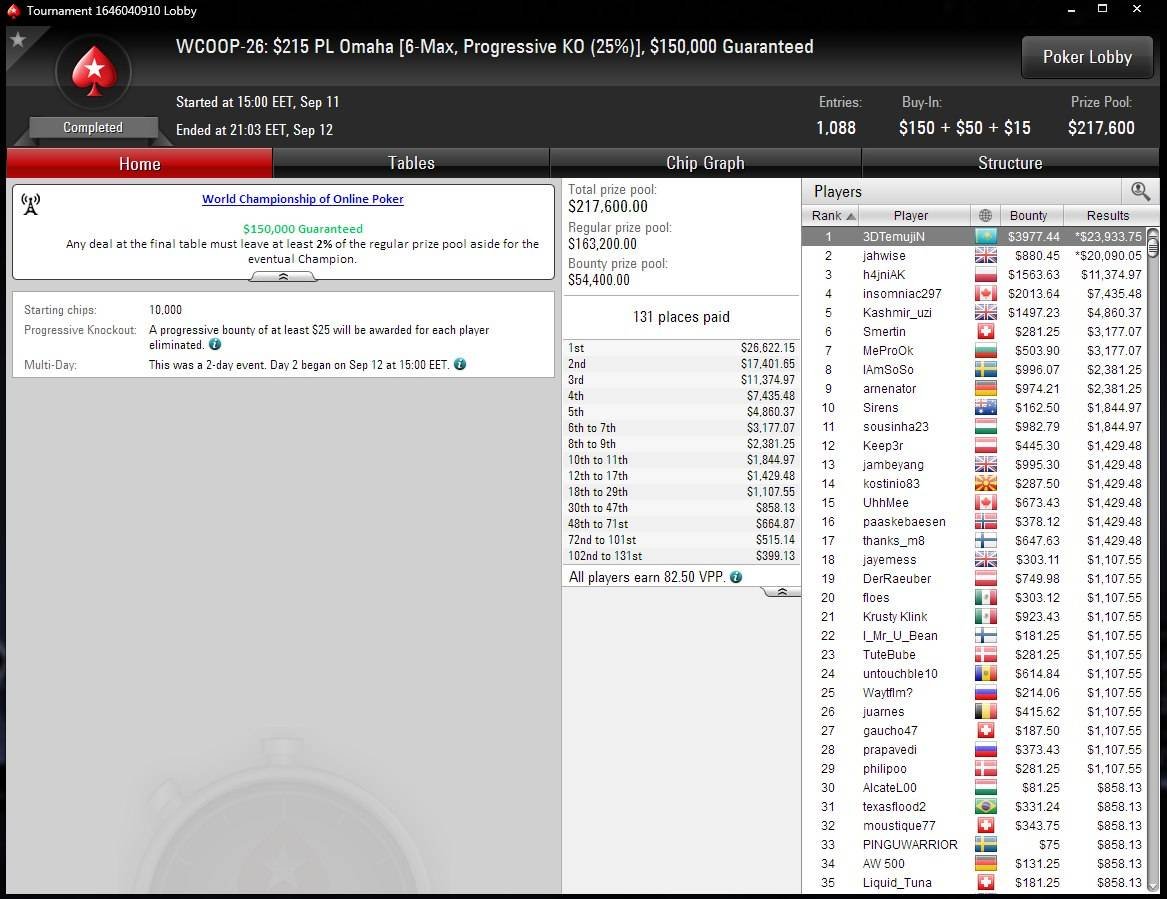 На WCOOP 2016 Шынгыс “3DTemujiN” стал обладателем титула Чемпиона по онлайн-покеру. Нашему игроку покорился двухдневный турнир с прогрессивными наградами за выбивание по Пот-лимит Омахе с бай-ином $215.