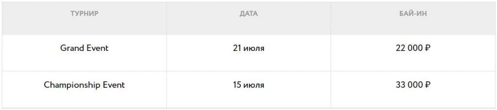 | [Сателлит] BPT – Championship Event, 4 места | Вс (00:00) | 3,000 ₽ (реэнтри) | 4 билета по 33,000 ₽ |