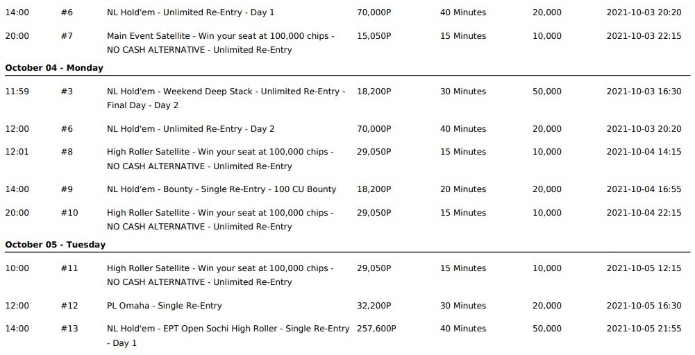 Расписание EPT Open Сочи 2021