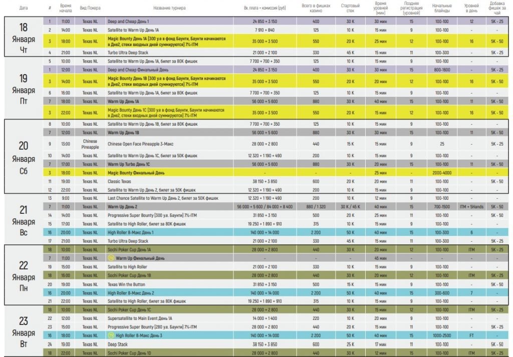 | воскресенье | 20:00 | [Финальный Сателлит] SPF Winter – Main Event День 1A, 10 мест | 7,500 (Re-entry) | 10 билетов по 77,000 |