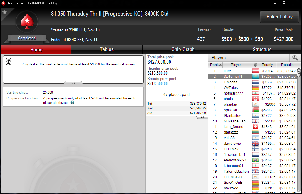 Thursday Thrill с бай-ином $1,050 считается не только одним из самых дорогих турниров в онлайн-покере, но и входит в число самых престижных. Ивент, в котором предусмотрены возрастающие награды за выбивание, привлекает много топовых покеристов со всего мира.