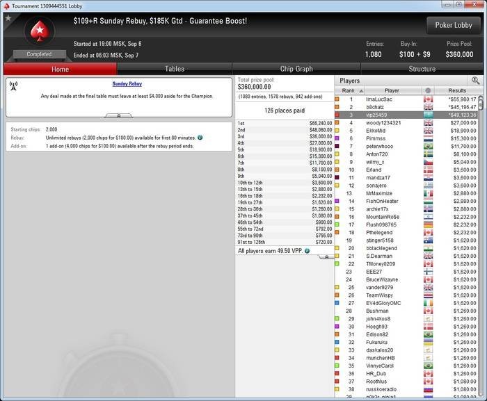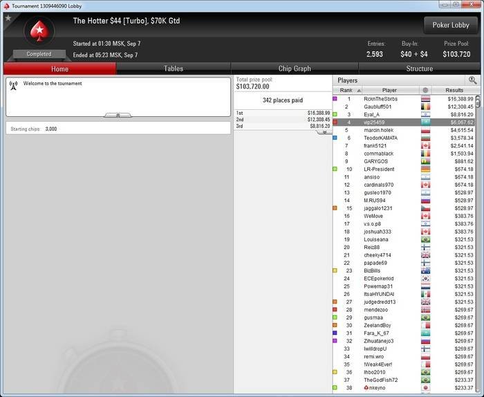В минувшее воскресенье Слава «vip25459» побывал на двух финальных столах, в результате чего ему удалось пополнить свой банкролл на солидную сумму. Он отметился в турнире $109+R Sunday Rebay, где занял 3 место и получил почти $50К, а также в турбо-турнире The Hotter $44 — 4 место и $6К.