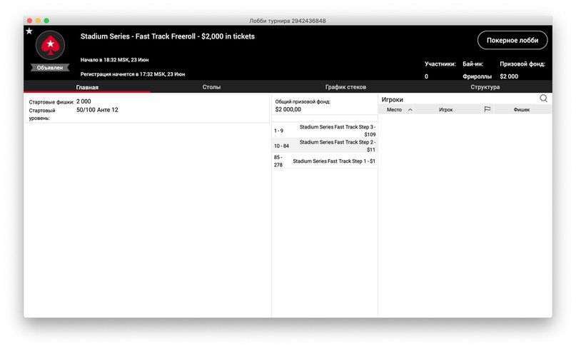 Каждый день в 18:32 МСК вы можете принять участие в Fast Track Freeroll. В бесплатных турнирах разыгрывается $2000 в виде турнирных билетов на Stadium Series: