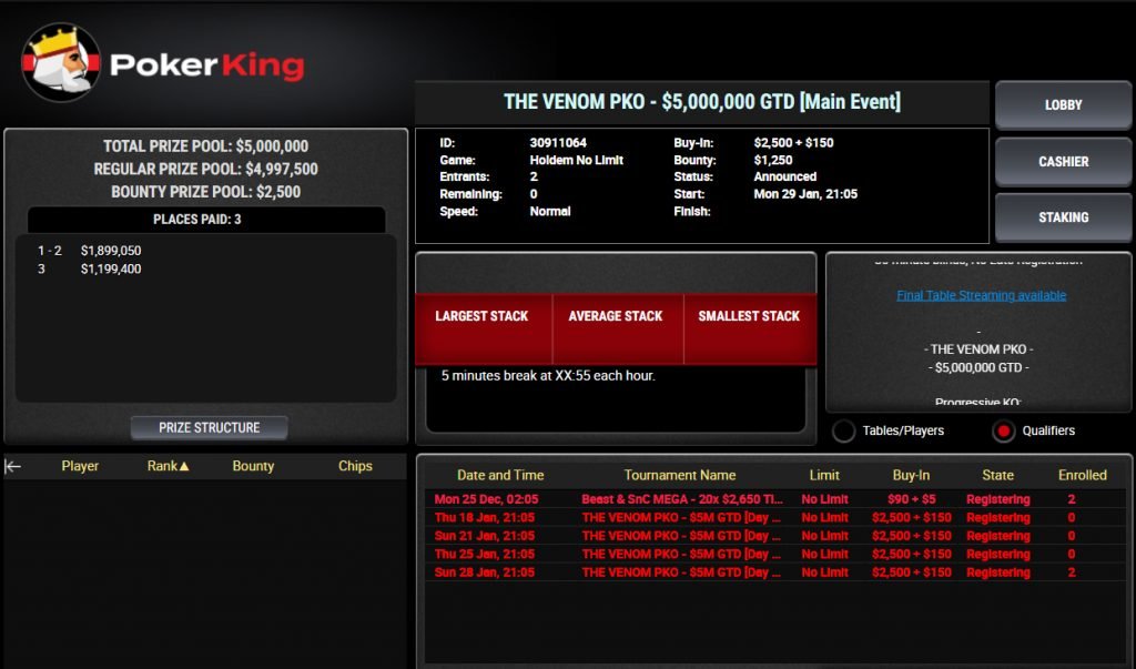 Флагманский турнир с нокаутами на PokerKing пройдет с 18 по 31 января 2024 года, отобраться можно с фрироллов.