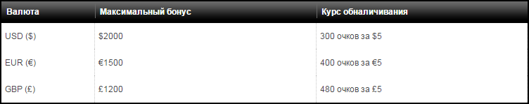 Бонус за депозит также доступен в евро (EUR/€) и фунтах стерлингов (GBP/£). В приведенной ниже таблице отображены суммы бонуса и курсы, по которым его можно обналичить в любой из предлагаемых на Titan Poker валют.