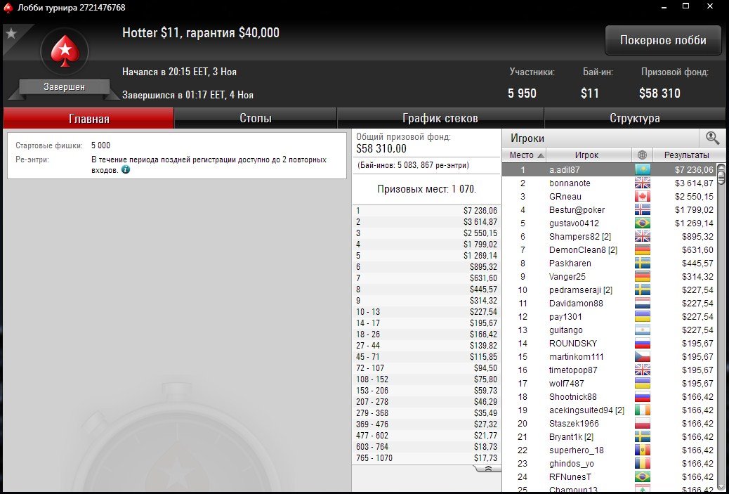 3 место за “a.adil87”. По сравнению с прошлым годом он поднялся на 1 строчку. Год принес ему более 40К призовых и 450 ИТМ.