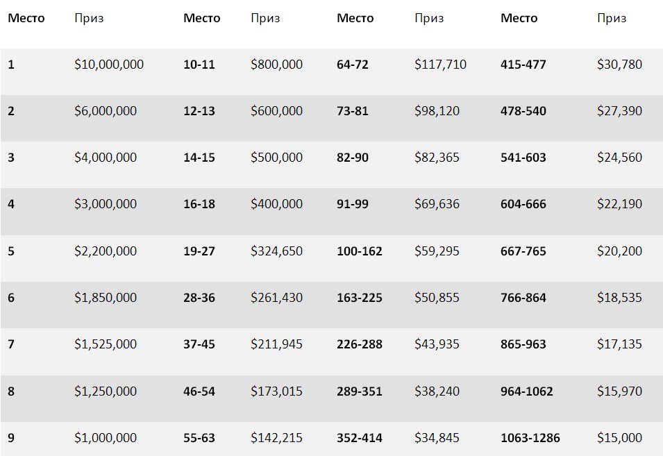 Выплаты Main Event WSOP 2019