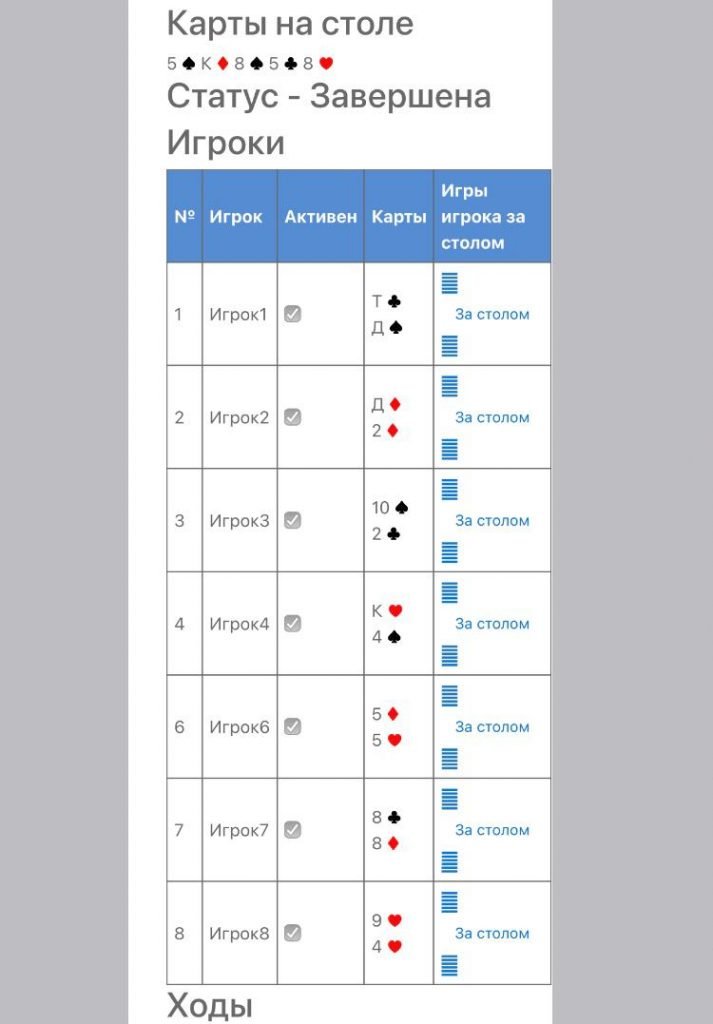 Первое слово Т – Д (Чек), Д – 2 (одномастные) Чек, 5 – 5 Пот 4.500., 8 – 8 (Кол) 4.500., Далее Пас, Пас. Двое в Игре.