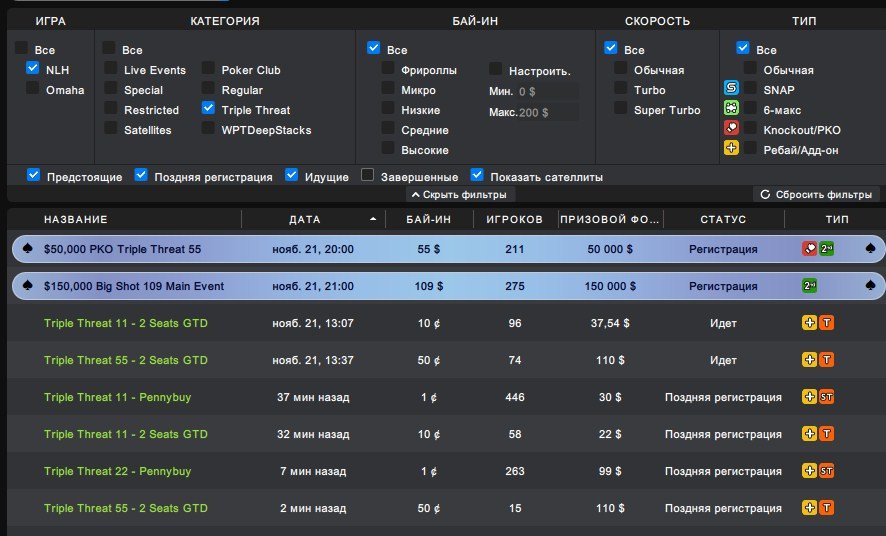 - 21:00 МСК — $50,000 PKO Triple Threat 55