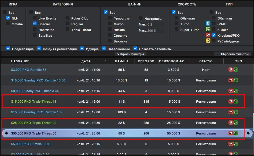 Отобраться на PKO Triple Threat возможно с фрироллов, которые проходят три раза в неделю, а также множеству дешевых сателлитов.