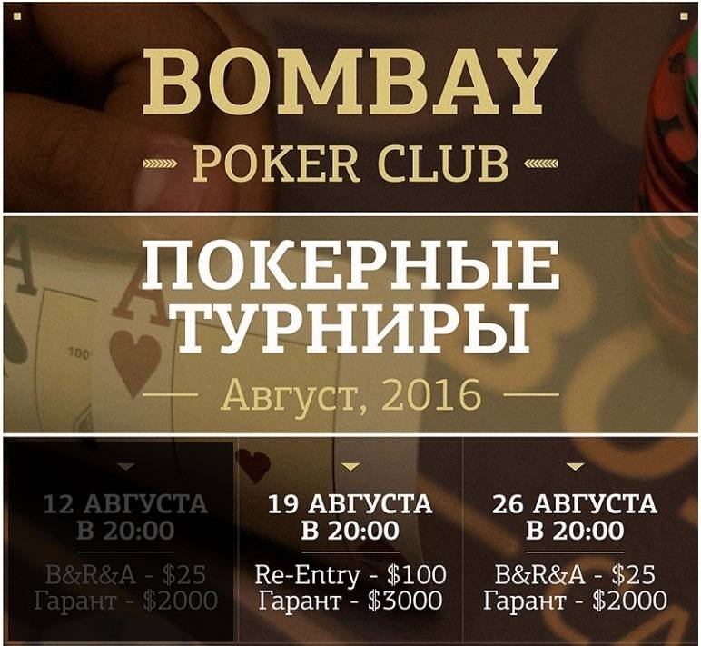 Каждую пятницу августа клуб «Бомбей» приглашает всех любителей покера сразиться за часть гарантированных призовых в наших турнирах, которые мы будем проводить согласно расписанию ниже.