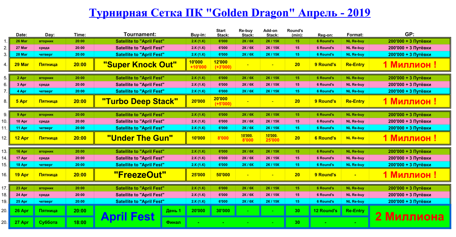 Ну что, Господа?!! Погнали!!! Покерный Клуб «Золотой Дракон» рад презентовать Вам, очередную Турнирную Сетку, на предстоящий месяц – Апрель 2019г.