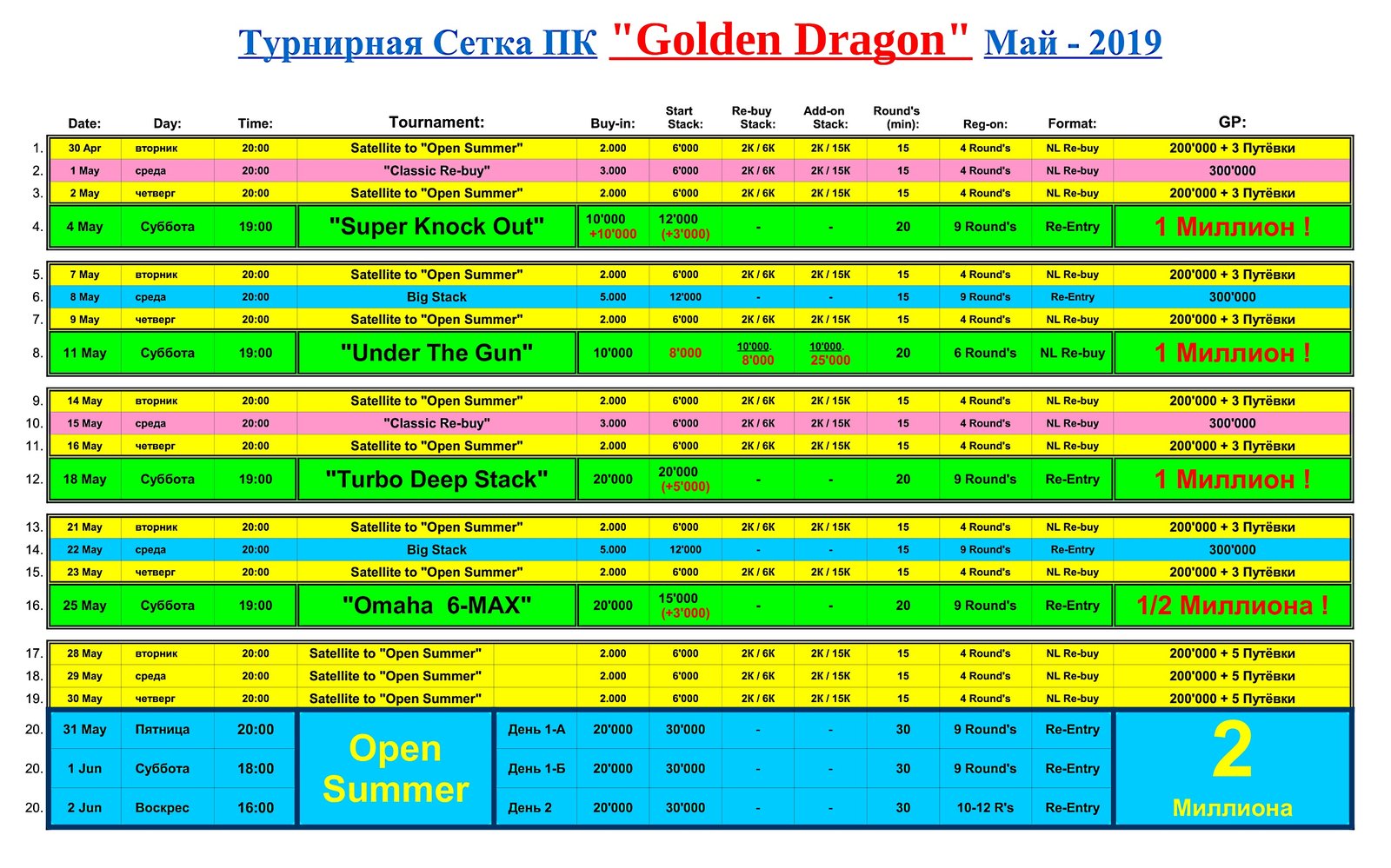 Предлагаем «пробежаться» по вышедшей Турнирной Сетке на Май месяц в Покер клубе «Золотой Дракон».