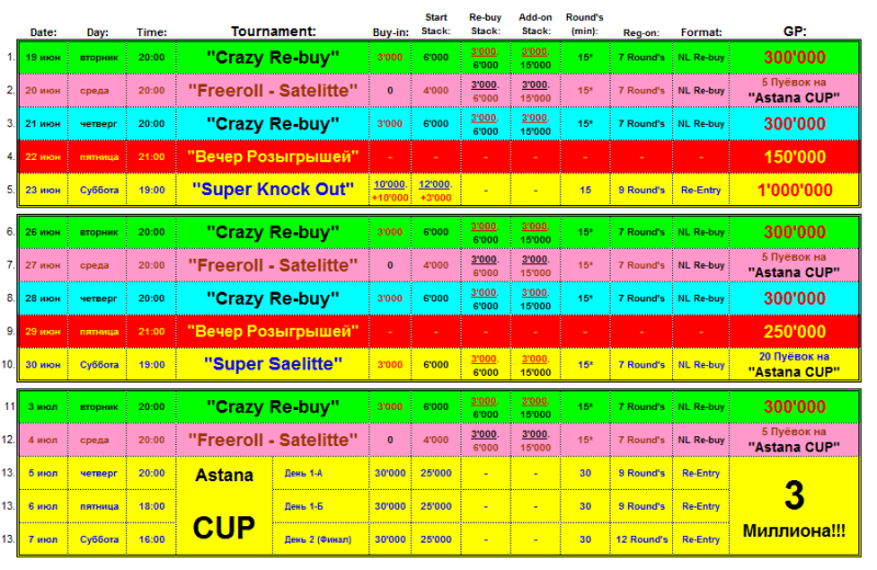 По средам мы проводим отборочные Турниры с Абсолютно бесплатным входом. Ребаи так же составляют демократические 3’000 тг. На данный момент разыгрываются Минимум по 5 Путёвок на предстоящий Турнир, который пройдёт уже в начале Июля с Гарантом в 3 Миллиона, под названием одноимённого праздника «Astana CUP».