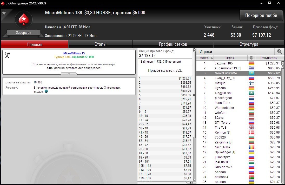 В одном из последних турниров серии MicroMillions отличился “GooDLucKwMe”. Ему удалось дойти до 3-го места в ивенте по смешанным играм за $3,30 и пополнить свою кассу на $669.