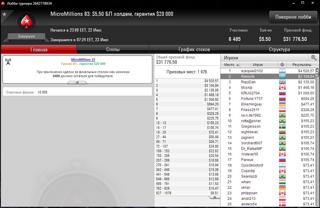 В турнире MicroMillions с бай-ином $5,50 и гарантией $20К отлично выступил игрок из Казахстана “Ranocik”.